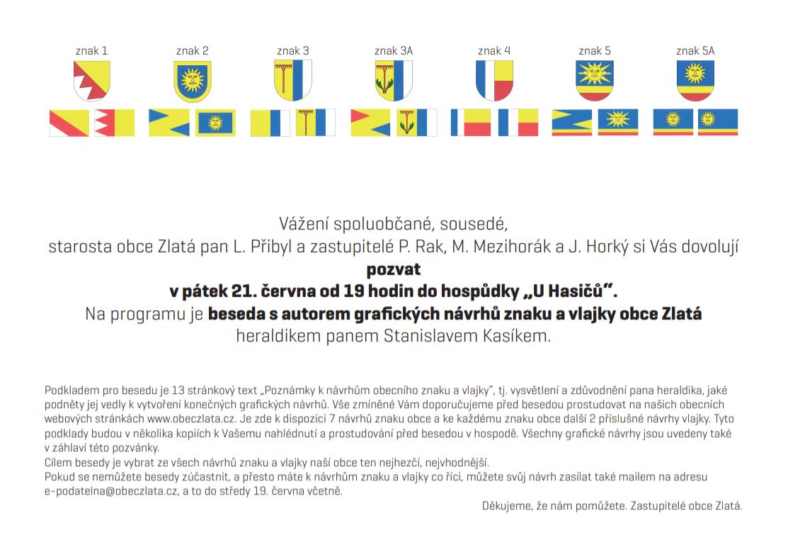 Podkladem pro besedu je 13 stránkový text „Poznámky k návrhům obecního znaku a vlajky“, tj. vysvětlení a zdůvodnění pana heraldika, jaké podněty jej vedly k vytvoření konečných grafických návrhů. Vše zmíněné Vám doporučujeme před besedou prostudovat na našich obecních webových stránkách www.obeczlata.cz. Je zde k dispozici 7 návrhů znaku obce a ke každému znaku obce další 2 příslušné návrhy vlajky. Tyto podklady budou v několika kopiích k Vašemu nahlédnutí a prostudování před besedou v hospodě. Všechny grafické návrhy jsou uvedeny také v záhlaví této pozvánky.