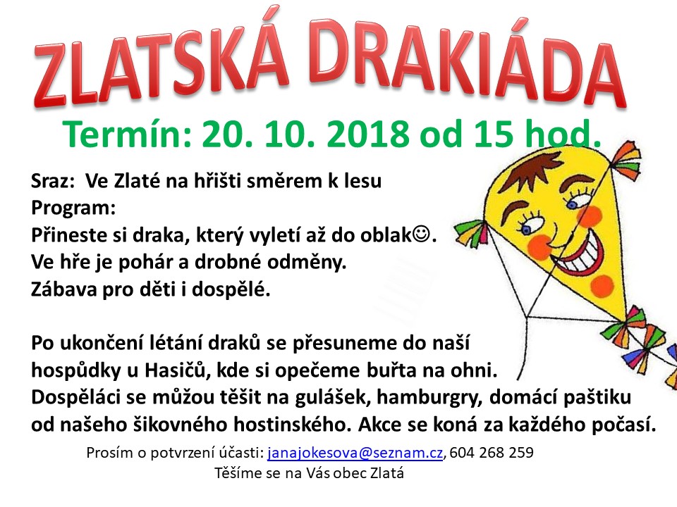 dovolujeme si Vám připomenout naší tradiční Drakiádu, která se koná tuto sobotu 20.10.2018 od 15hod. Tento rok budeme draky pouštět u Altánku směrem k lesu.