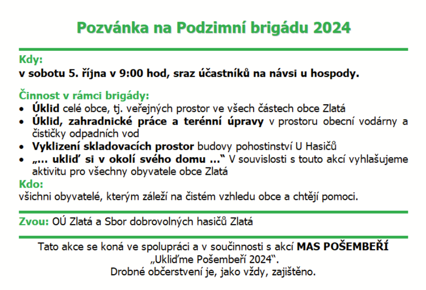 Organizátor: Obecní úřad a Sbor dobrovolných hasičů Zlatá