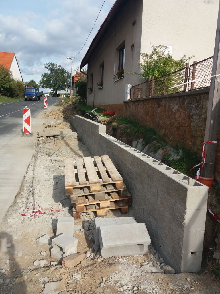 Stav postupu prací je vidět v reálu a v současné době se s výstavbou blížíme do poloviny druhé etapy. Po konzultaci ze statikem se podařilo vyřešit preventivní opatření pro ochranu základů jednoho z domů na trase. V tomto případě šlo o realizaci opěrné zdi.