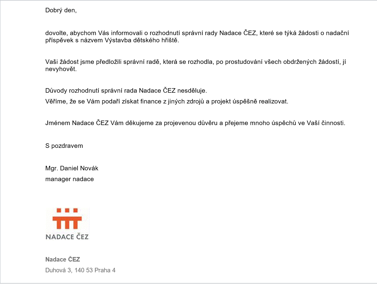 Vyjádření společnosti ČEZ k dotaci o příspěvek na dětké hřiště